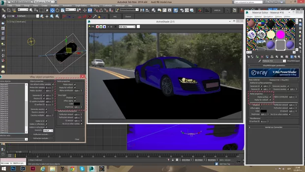 Здравейте, Трябва ми малко помощ за тази задача. Искам да поставя колата върху път от картинка HDRI. Всичко добре обаче колата няма сянка. Пробвах да създам плоскост/Plane под нея, и от десен бутон v-ray Propertis да сложа отметки на Matte objekt и Direct Light а и също от там стойността Alpha Contribution да я намаля на -1,0. Плоскостта под автомобила стана черен и толкова. HDRI картинката от матриалния редакртор я копирах като инстансно копие в слота Environment & Effects но и това не даде някакъв особен резултат. Помъчих се да използвам и материал VrayMtlWrapper, обаче и с него нищо не стана. Не съм сигурен коло правилно съм го използвал. Благодаря.