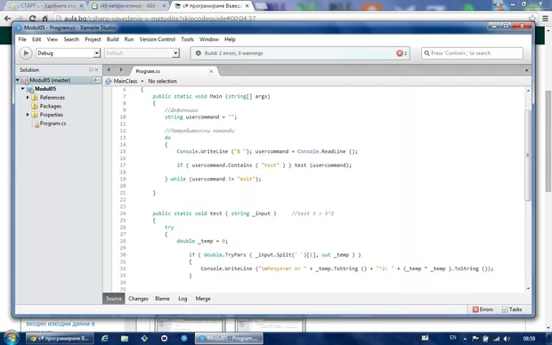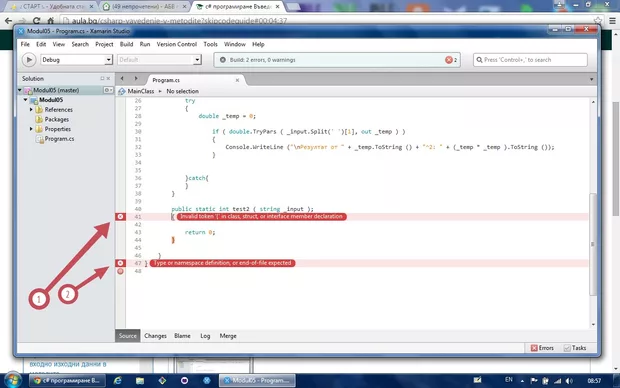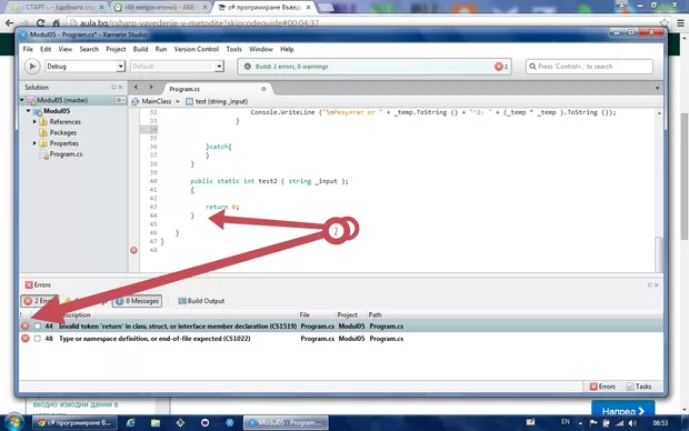 Минавам урока за трети път. Записвал съм на лист ред по ред, така както е в урока, след което го изписвам в конзолата. И когато включвам Ctrl-F5 се съобщава за две грешки. Вероятно имам някакъв пропуск, но не мога да го открия!
