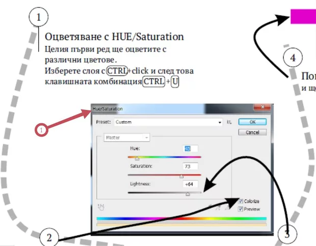 Hue/Satoriation работи със следните цветни модели - RGB / CMYK / Index / Lab. НЕ РАБОТИ с Grayscale / Duotone / Multichanal.