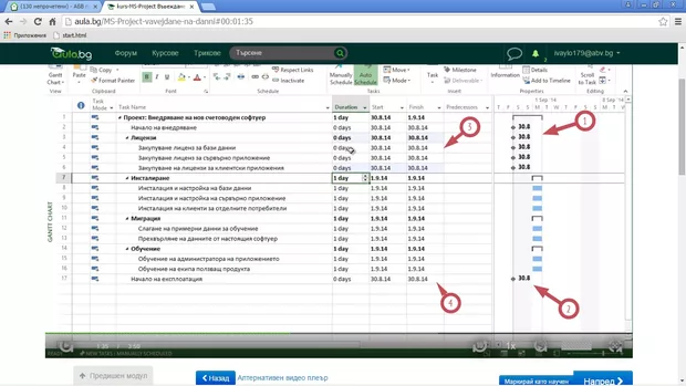 Защо, моля, при мен когато задам в Duration 0 дни на ID 2, 3, 4, 5, 6 и 17, те не се отместват (картинка 1) автоматично към събота, както е в урока (картинка 2) и не си сменят датата от 1.9.14 на 30.8.14 (там (в урока) също става автоматично отместване и на ID 1 към събота, макар че неговият Duration си остава 1 ден)? При мен ID 2, 3, 4, 5, 6 и 17 си остават на 1.9.14 и не отиват на 30.8.14 като в урока (също и ID 1 си остава на 1.9.14 и също не отива на 30.8.14). Благодаря.