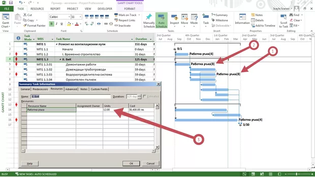 Реших да си направя 1 експеримент, а именно, освен 8-те работника, въведени от лектора за задачата Водоразпределителна система (позиция 1) от клона В и К, въведох още работници (8 в случая за задачата Демонтажни работи в случая (позиция 2) пак от клона В и К). Така работниците на този клон станаха 16. Въпреки това обаче първоначално въведената от лектора обща за клона В и К бройка 12 си остана непроменена (позиция 3). Защо, моля, не се получи промяна? Благодаря.