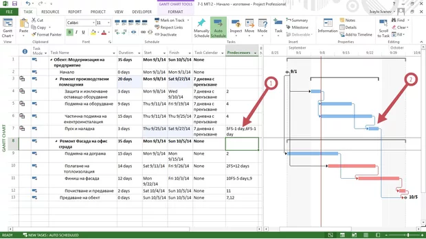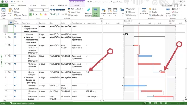 За изпълнението на задачата са необходими три работни дни. Двата са преди периода с неработните дни, а третият след тях. Но MS Project го изобразява като непрекъснат процес, т.е. с по-голяма продължителност от зададения.